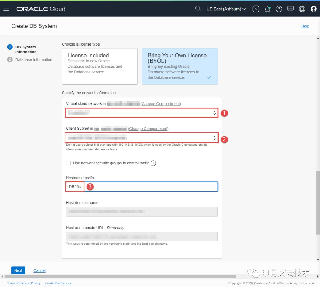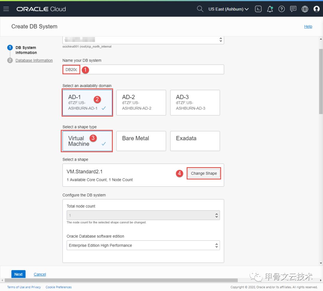 如下图所示,给自己的数据库系统设定一个名字,今天我们就将这个名字这暂时设定为DB20c,然后选择这个服务器所在domain,我选择了美国的数据中心,并且选择了1个CPU的虚拟机Shape。您可以根据自己的情况选择主机的类型与大小。