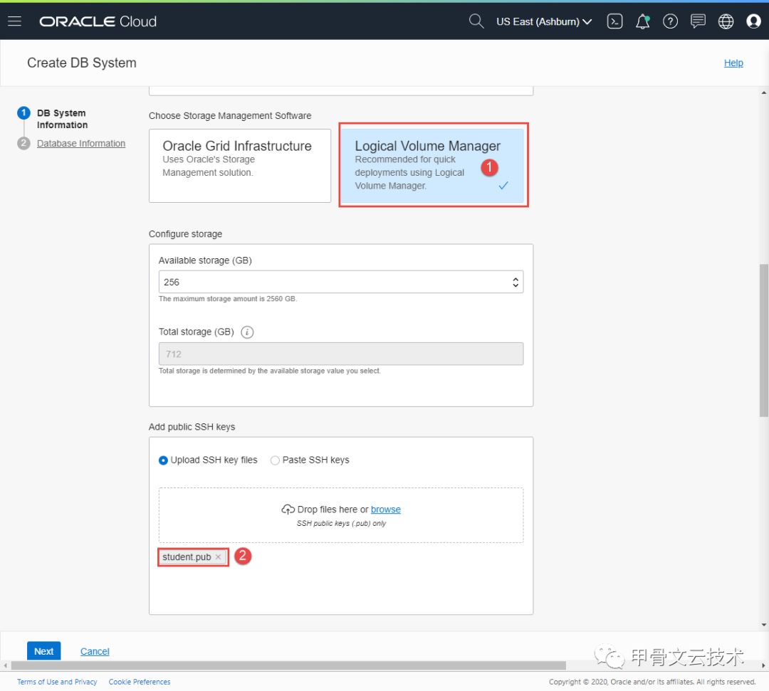 您可以使用GRID也可以选择逻辑卷管理,今天我们选择逻辑卷管理。并且给出访问公钥,如下图中2所示。