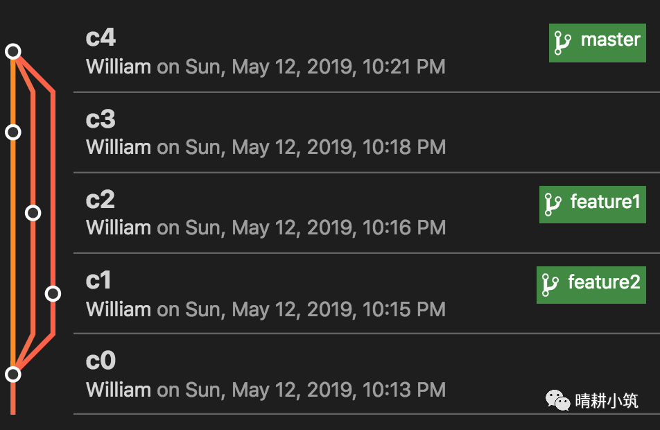 如图所示,c4就是c1,c2,c3在分支合并后产生的合并提交: