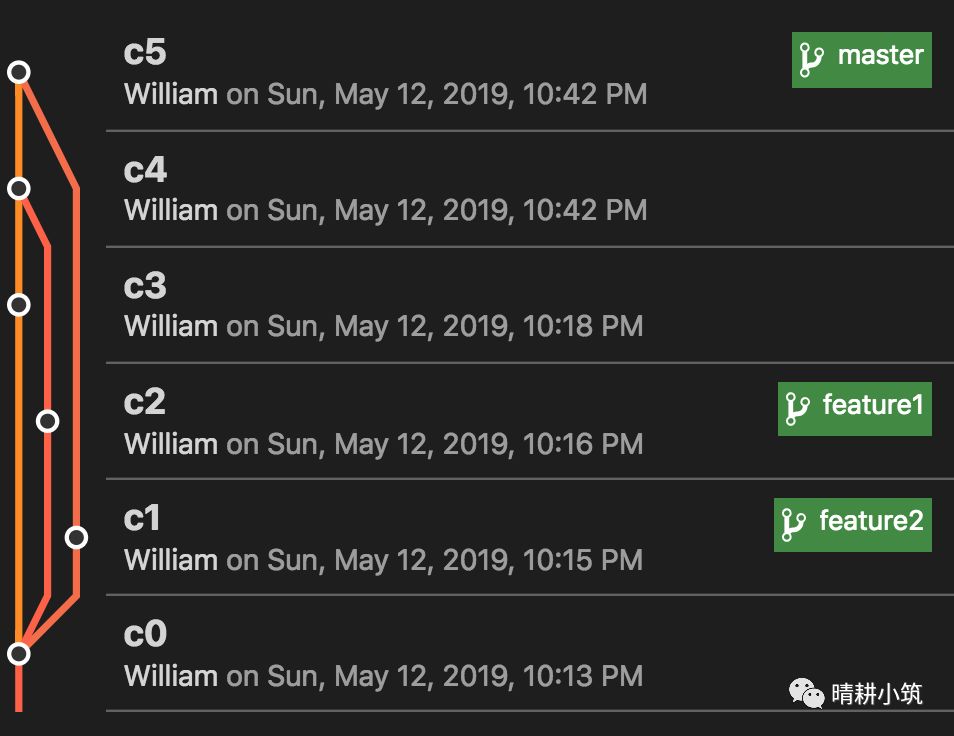 master分支上余下的提交历史和feature1的提交历史是完全一样的: