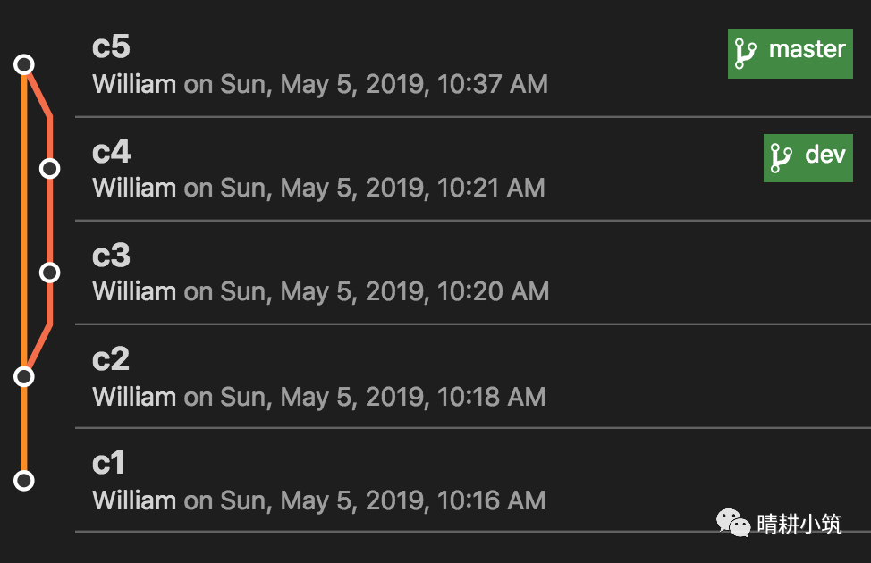 这一次,由于没有采用Fast-Forward Merge,Git会为我们生成一个新的提交。在执行git merge时,我们还利用参数-m为这个新的提交记录指定了“名称”:c5。这里是合并之后的提交历史: