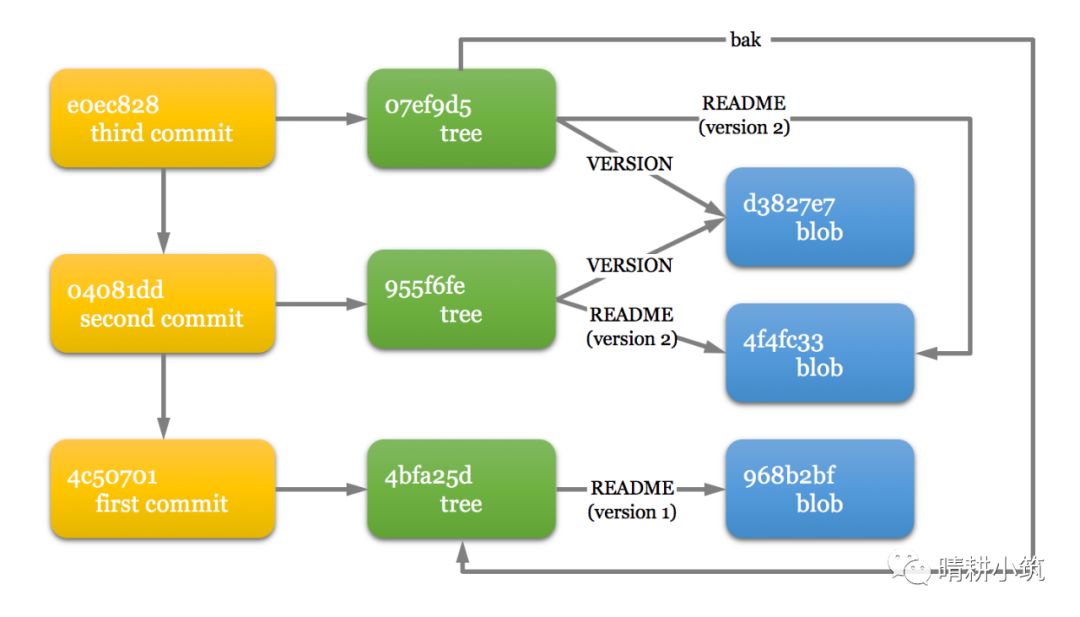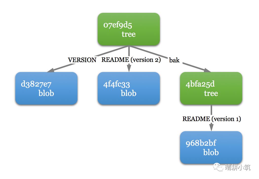最后一行表明,我们的bak子目录(即唯一键为4bfa25d打头的tree对象)的确已经被作为子树加入到当前的tree对象里了。如下图所示: