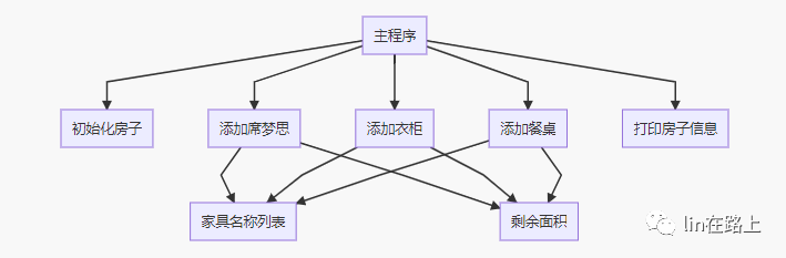 需求:往一个房子中添加家具(席梦思、衣柜、餐桌),最后打印出户型、总面积、剩余面积、家具名称列表