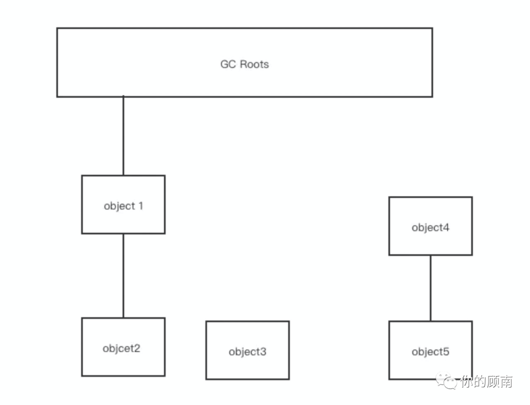 可达性分析算法是从离散数学中的图论引入的,程序把所有的引用关系看作一张图,通过一系列的名为 “GC Roots” 的对象作为起始点,从这些节点开始向下搜索,搜索所走过的路径称为引用链(Reference Chain)。当一个对象到 GC Roots 没有任何引用链相连(用图论的话来说就是从 GC Roots 到这个对象不可达)时,则证明此对象是不可用的,如下图所示。在Java中,可作为 GC Root 的对象包括以下几种: