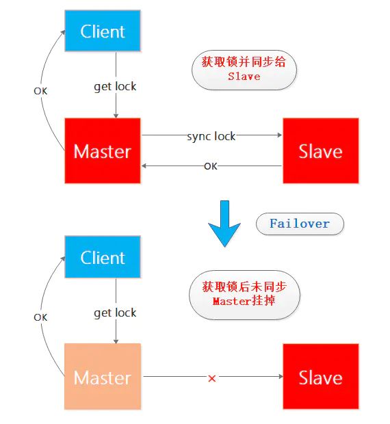 在单Matster-Slave的Redis系统中,正常情况下Client向Master获取锁之后同步给Slave,如果Client获取锁成功之后Master节点挂掉,并且未将该锁同步到Slave,之后在Sentinel的帮助下Slave升级为Master但是并没有之前未同步的锁的信息,此时如果有新的Client要在新Master获取锁,那么将可能出现两个Client持有同一把锁的问题,这样就会导致系统中同样一把锁被两个客户端同时持有,不安全性由此产生。来看个图来想下这个过程: