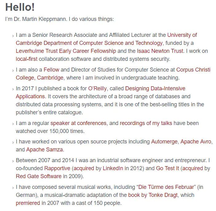 2016年2月8号分布式系统的专家马丁·克莱普曼博士(Martin Kleppmann)在一篇文章How to do distributed locking 指出分布式锁设计的一些原则并且对Antirez的Redlock算法提出了一些质疑。笔者找到了马丁·克莱普曼博士的个人网站以及一些简介,一起看下: