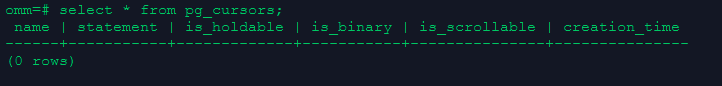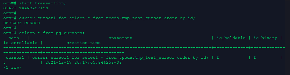 CURSOR cursor1 FOR SELECT * FROM tpcds.reason ORDER BY 1;–在系统视图pg_cursors中查看可用游标