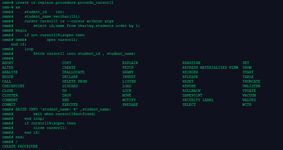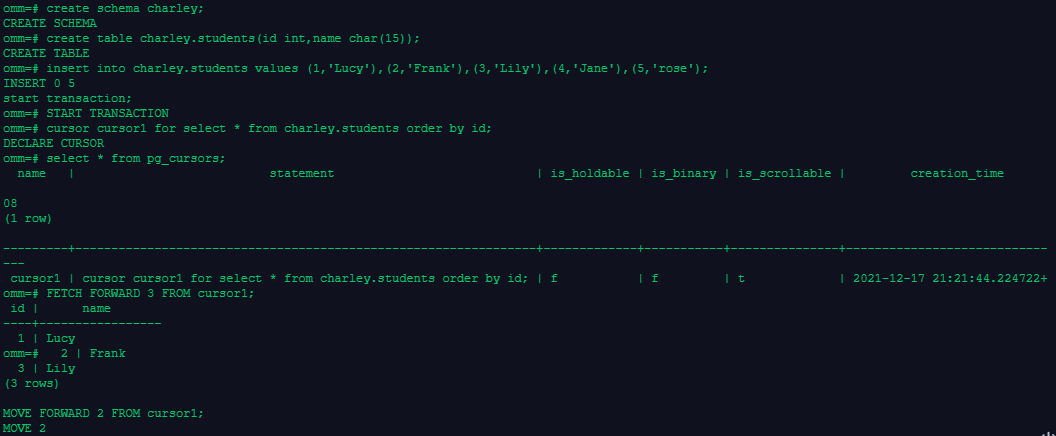 1.创建游标,且使用select子句指定游标返回的行,分别使用FETCH抓取数据,MOVE重定位游标