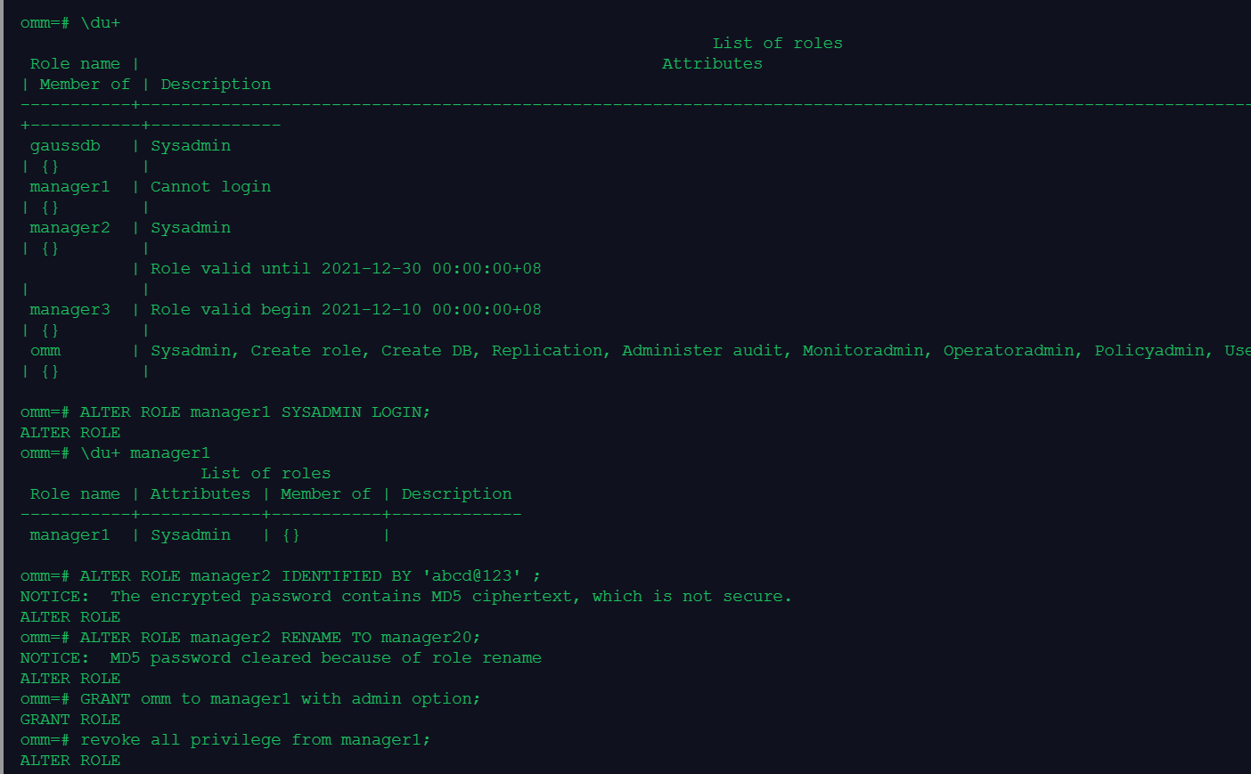 omm=# alter role role2 identified by 'password_4' replace 'password_2';