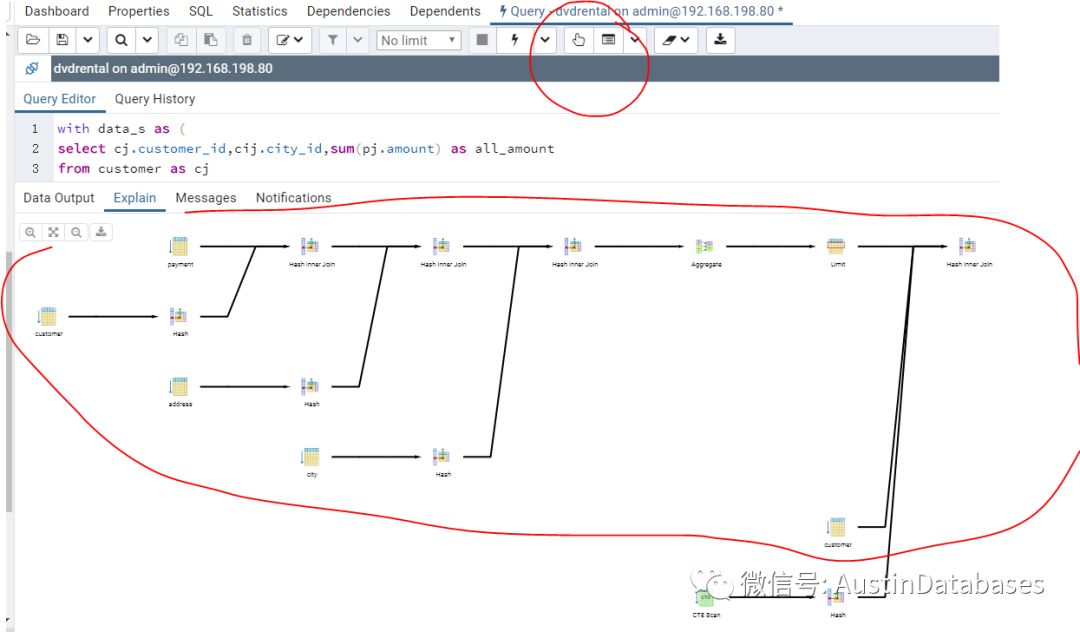 实际上 PG 官方的pgadmin,可以很好的将要执行的语句变成图形化的方式来展示执行的计划,看到下面的图,用SQL SERVER 的小伙伴可能会比较熟悉,虽然么有SQL SERVER 的图形化 SSMS 的功能多,但分析来说已经很不错了。配合非界面化的文字来协同分析,可以达到比较好的结果。