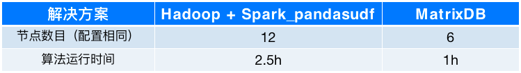 在每台物理机配置相同的情况下,两代集群性能的整体对比情况表,如下图:可以看出 MatrixDB 仅使用了一半的机器数量,并且算法运行时间从2.5小时减少到1小时。