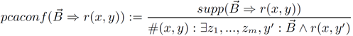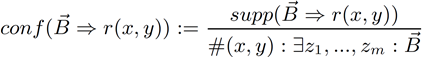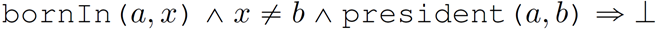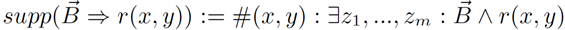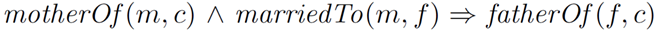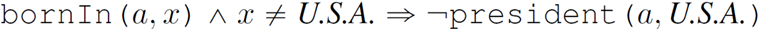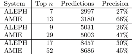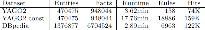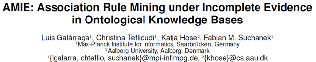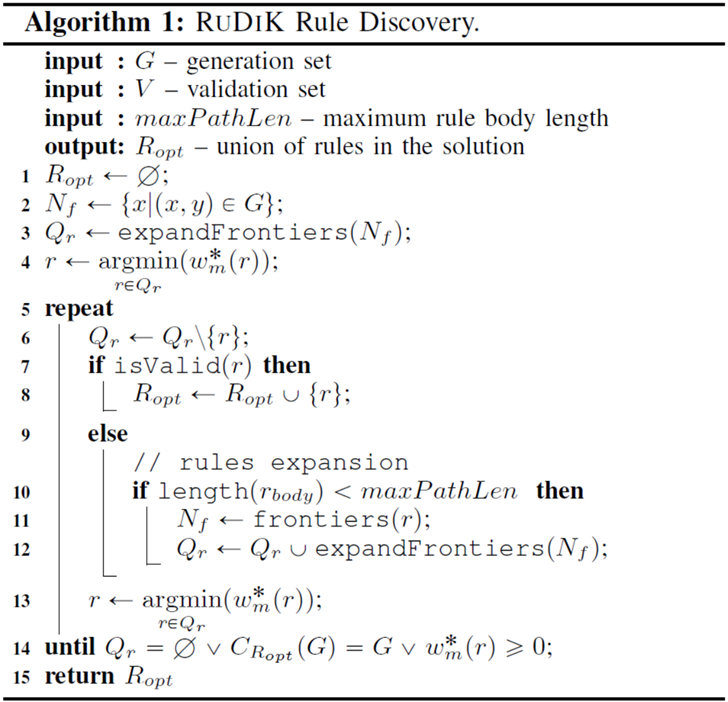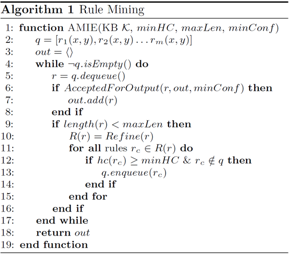 面向知识图谱的规则挖掘研究对象是知识图谱上的一阶谓词逻辑规则,通常由body ⇒ head(规则体⇒规则头)的形式构成,规则体由多个原子的析取组成,规则头是包含目标谓词的单个原子,例如:知识图谱上的规则挖掘可以用来描述数据的一般规律,有助于理解数据,并在此基础上进行推理、补全、和检错纠错。本文将介绍三个面向知识图谱的规则挖掘方法:AMIE[1]是经典的规则挖掘模型,Rudik[2]和IterE[3]模型分别采用不同的思想在规则挖掘过程中引入实体、属性信息。接下来分别进行介绍。其中“连通”要求规则中每个原子通过共享变量或实体传递相连,“闭式”限定规则中每个变量都至少出现2次。规则挖掘的最朴素算法是枚举所有可能的规则,但该方法搜索空间大,不适用于大规模知识图谱。本文的主要思想是采用三个挖掘操作算子迭代地扩展规则,同时定义多个标准对规则进行评估和剪枝。三个挖掘操作算子为:1)添加悬挂边:边的一端是一个未出现过的变量,另一端(变量/常量)在规则中出现过;2)添加实例边:边的一端在规则中出现过的常量/变量,另一端是未出现过的常量,即知识图谱中的实体;3)添加闭合边:连接两个已存在于规则中的常量/变量的边。在规则挖掘的同时,本文定义了多个标准对规则质量进行评估:以上标准置信度中,前提是将知识图谱中出现的元组认为是正确信息,未出现的元组认为是错误信息,这不符合知识图谱的开放世界假设。为了解决这一问题,本文提出了部分完整性假设(partial completeness assumption, PCA),认为如果存在某个实体x的关系r属性, 则知识库中包含了x的所有关系r属性。由此提出了PCA置信度。该算法的输入是整个知识图谱k,以及超参数:最小头覆盖度、最大规则长度、最小置信度。第2行将候选规则队列初始化为目标谓词相关三元组作为规则头的空规则。第3行将输出集合初始化为空。第4行至第17行迭代对候选规则进行扩展、评估、剪枝。第6行判断当前出队的规则是够满足输出要求(规则为闭式规则,置信度大于最小置信度,以及置信度大于比其少一个原子的规则置信度),若满足则加入输出集合。第10行继续将不满足输出要求的规则进行扩展。本文将所提模型AMIE与两个已有模型进行了比较,在YAGO2 sample数据集上,AMIE挖掘出207条符合要求的规则,而WARMR仅挖掘出41条;在YAGO2数据集上,AMIE挖掘出335条符合要求的规则,而WARMR仅挖掘出56条。与WARMR模型的预测结果比较可以得出本文模型挖掘出的规则预测结果精确度更高。此外,本文模型还在其他知识图谱进行了实验,结果见下表:在DBpedia上挖掘的规则数量多于YAGO,原因是DBpedia上的关系更多。本文的目标同样是挖掘连通、闭式的霍恩规则,与AMIE方法不同的是,本文挖掘出的规则还包括负规则,即包含否定表述的规则,另外还引入了数字、日期等属性值的比较和实体间的比较。例如:本文研究的问题可以定义为:给定知识图谱kb,针对目标谓词的生成集G,验证集V,kb上的所有有效霍恩规则集R,及规则对应的权重。目标是搜索规则子集R’,使规则集权重最小。规则的权重越小则质量越高,权重为0表示规则完全覆盖G,且不覆盖V。验证集V:不符合目标谓词的实体对。由于知识图谱的开放世界假设,构造验证集数据不能采用随机采样的方法。本文根据封闭世界假设(给定主语和谓词,若KG中包含一个或多个宾语,则它已包含所有可能的值)通过以下方法进行构造:(x,y)之间有相连谓词,但不是目标谓词,且x或y有目标谓词相连,另一端不是y或x。注意挖掘负规则时方法不变,将生成集和验证集的数据对换即可。给定目标谓词相关的生成集、验证集后,则可以在此基础上进行候选规则生成。本文的基本思想是连通的规则体可以翻译为一段路径。于是用过以下标准查询符合要求的路径来构造候选规则:3)在x/y/已访问过的其他顶点结束(长度小于最长路径长度限制)。另外值得注意的是,本文在规则挖掘时引入了五个特殊关系,使规则中包含属性值、实体的比较信息,具体处理如下:1)增加特殊关系