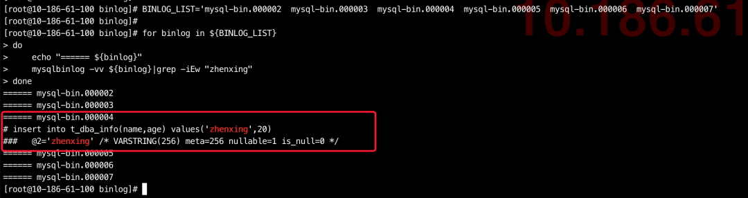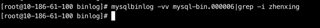 mysqlbinlog -vv ${binlog}|grep -iEw "zhenxing"