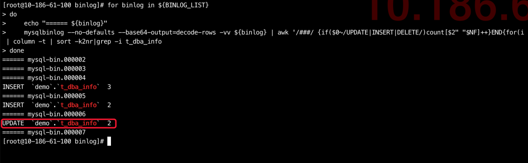 mysqlbinlog --no-defaults --base64-output=decode-rows -vv ${binlog} | awk '/###/ {if($0~/UPDATE|INSERT|DELETE/)count[$2" "$NF]++}END{for(i in count) print i,"\t",count[i]}' | column -t | sort -k2nr|grep -i t_dba_info