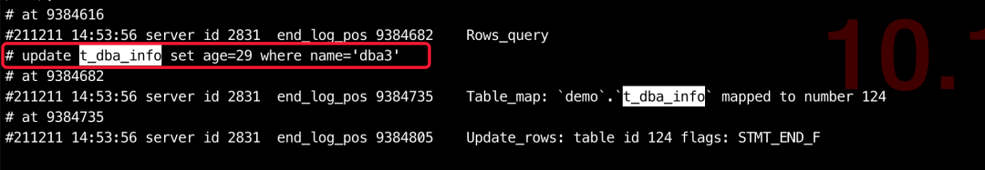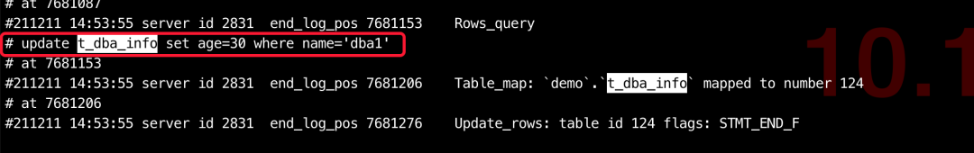 通过解析发现这个binlog文件做对demo.t_dba_info表的UPDATE操作并不是针对zhenxing这条记录的,分析到这里发现比较迷惑了,数据明明插入了,也没做修改怎么就不见了,难道做了一些特殊操作