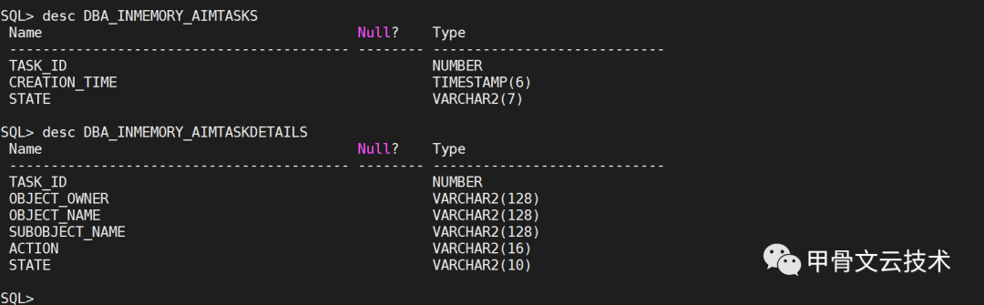 您可以通过查询DBA_INMEMORY_AIMTASKS和DBA_INMEMORY_AIMTASKDETAILS来了解Automatic In-Memory的后台任务情况。