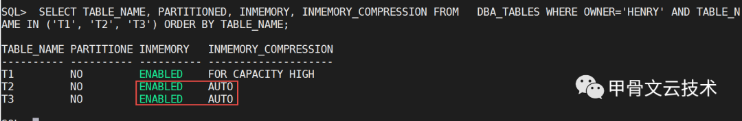 我们看到T1表的IM属性已经开启,这是我们在没有设定INMEMORY_AUTOMATIC_LEVEL参数之前,手工设定的情况。