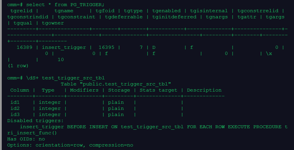 3.使用系统表PG_TRIGGER和\dS+查看触发器