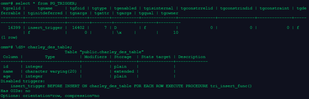 3.使用系统表PG_TRIGGER和\dS+查看触发器