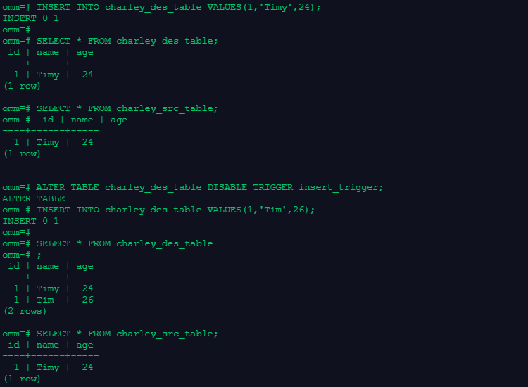 INSERT INTO charley_des_table VALUES(1,'Timy',24); SELECT * FROM charley_des_table; SELECT * FROM charley_src_table;ALTER TABLE charley_des_table DISABLE TRIGGER insert_trigger; INSERT INTO charley_des_table VALUES(1,'Tim',26); SELECT * FROM charley_des_table; SELECT * FROM charley_src_table;