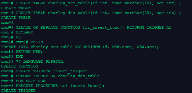 CREATE TABLE charley_src_table(id int, name varchar(20), age int) ; CREATE TABLE charley_des_table(id int, name varchar(20), age int) ;CREATE OR REPLACE FUNCTION tri_insert_func() RETURNS TRIGGER AS $$ DECLARE BEGIN INSERT INTO charley_des_table VALUES(NEW.id, NEW.name, NEW.age); RETURN NEW; END $$ LANGUAGE PLPGSQL;CREATE TRIGGER insert_trigger BEFORE INSERT ON charley_des_table FOR EACH ROW EXECUTE PROCEDURE tri_insert_func();
