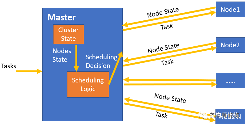 在集群管理中,单体调度模块即为调度器,即使用中心化的方式管理资源和任务调度。
