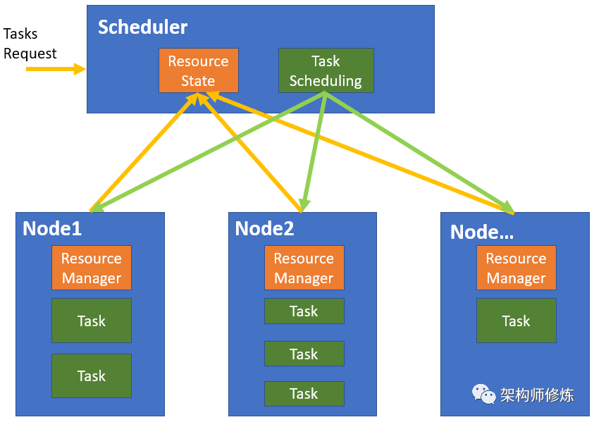 当然,不同的分布式架构中调度器的原理可能会不相同,在我们开发中接触最多的最常见的就是单体调度器,即调度匹配任务和分布式系统中的空闲资源,直白的解释就是说调度器管理着任务和分布式中的所有资源。