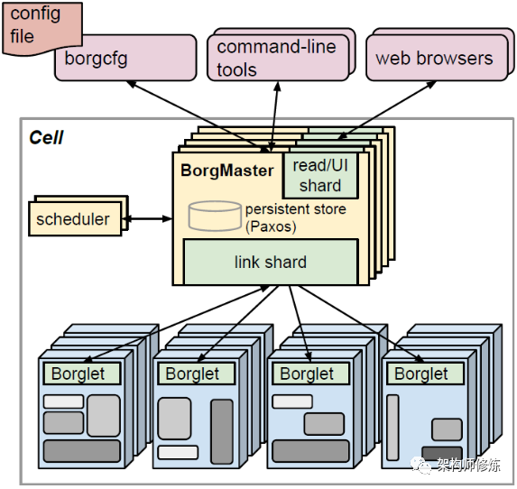 我们知道调度的核心就是为作业或者任务选择合适的资源匹配,首先我们先来看看Brog的系统架构图。