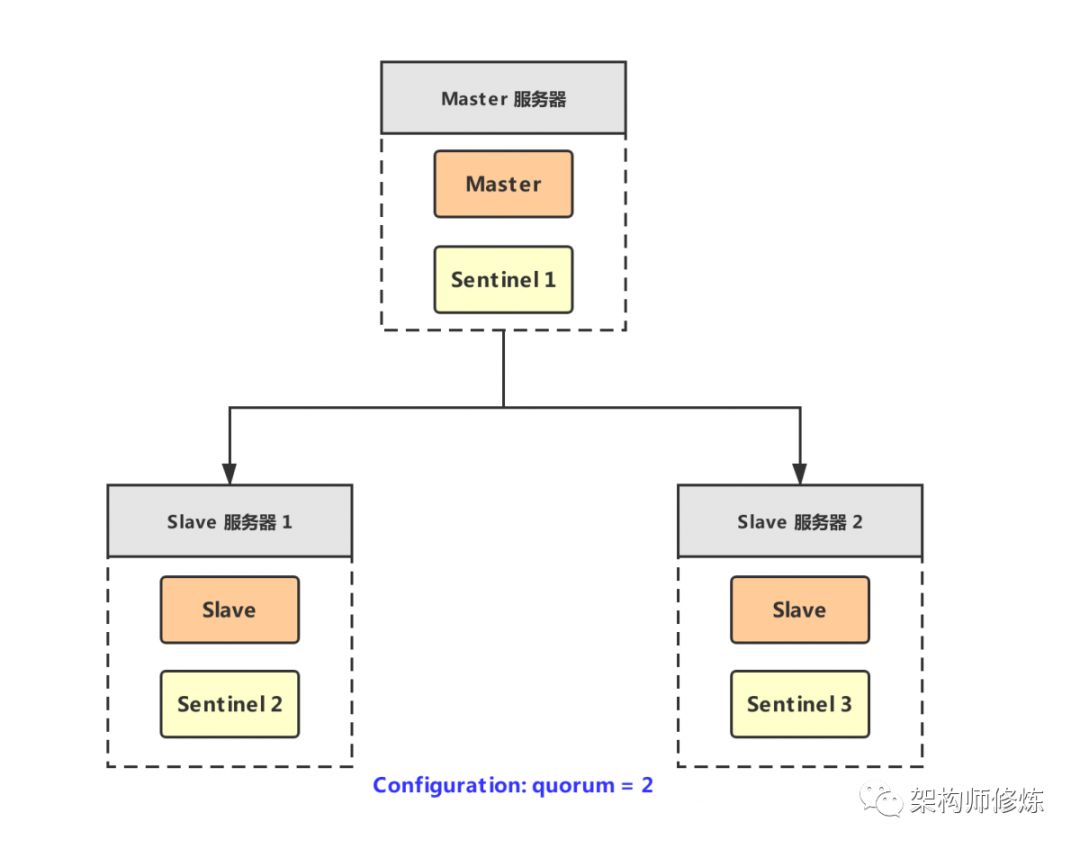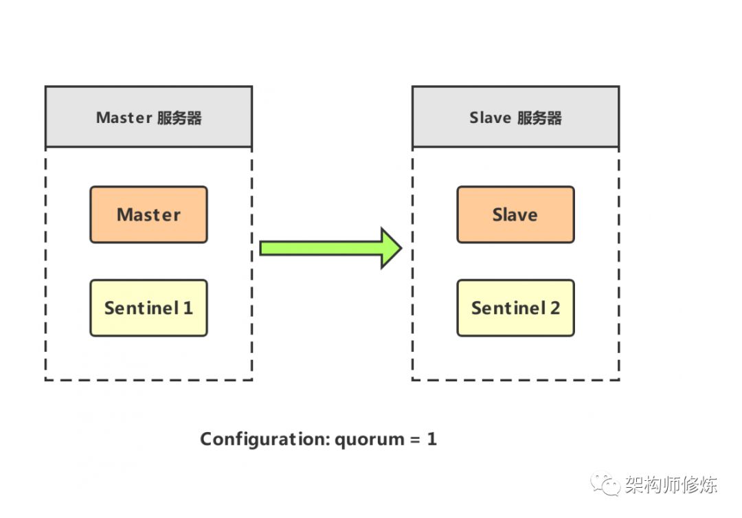 你可能会问,哨兵集群 2 个节点难道就不行吗?好,如果咱们的哨兵集群只部署了两个节点,那么 quorum=1,