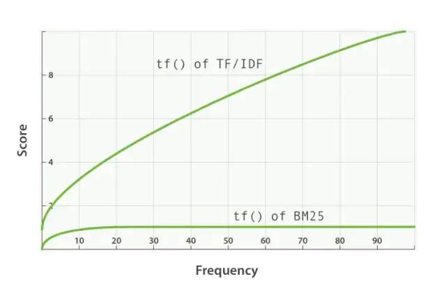 相比传统的TF*IDF相关性算法,在BM25中词频的影响降低。词频的影响一直在增加,但渐渐地逼近一个值。