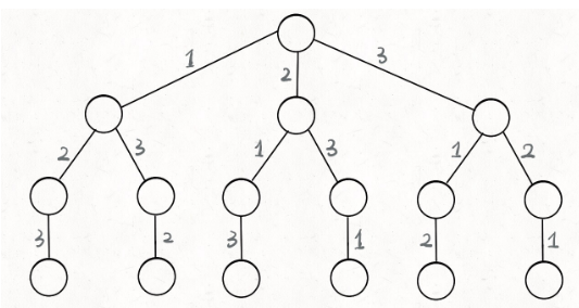 先固定第一位为 1,然后第二位可以是 2,那么第三位只能是 3;然后可以把第二位变成 3,第三位就只能是 2 了;然后就只能变化第一位,变成 2,然后再穷举后两位……