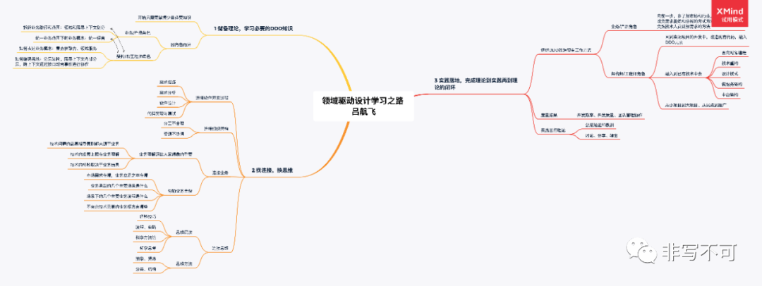 从我个人的经验看,要把学习DDD看作是一个和你现有知识融汇贯通的过程。也就是说要从一开始就建立DDD相关的知识树,把新知识点和你已有知识点产生连接才会变成你的知识。否则就像漏斗,倒进去再多最后什么也留不住。