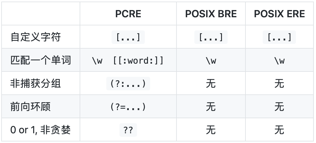 PCRE、GNU BRE、GNU ERE 对比
