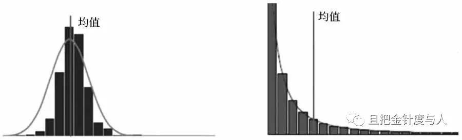 另一个平均数的误区是:我们在谈论平均数据时总会下意识地忽略用户的分布状况。比如,当听到一个描述说"这个页面的日平均浏览量高达200万"时,你的直觉反应是什么?深谙数据分析之道的运营者一定会继续追问"这个数据的具体分布情况如何"。因为他们脑海中会立刻反射两张不同的图像出来: 均值相等的正态与长尾分布图