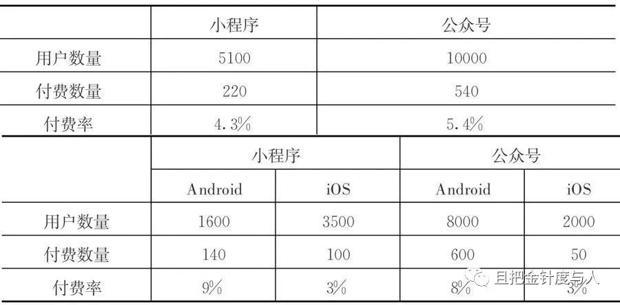 总体看,小程序的付费率低于公众号,但实际上当我们进一步分解去看,无论是Android平台还是iOS平台,小程序的付费率都要高于公众号的付费率。