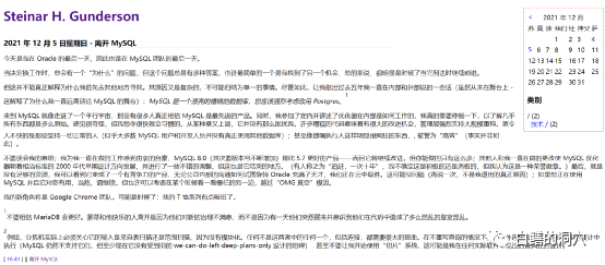12月5日Steinar Gunderson在博客上发的那封离开Oracle Mysql优化器研发团队,返回老东家谷歌的离职感言注定是会掀起轩然大波的,因为这又会刺激到很多人脆弱的神经。Steinar H. Gunderson在业界也只能算是个小人物,他加入到Mysql优化器研发团队之前在谷歌从事离线图像搜索工作,这回又回到谷歌,加入chrome团队。不过如果仔细研究过Steiner的简历后发现他虽然从事的工作不多,但是都是极为强大的,比如说为国际象棋世锦赛提供实时分析预测的那个超级计算程序也出自他的手。我想他在Mysql优化器研发团队中的角色应该也是一个重要骨干。