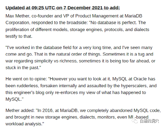 不过Mariadb的联合创始人Max Mether在7号回复了Steiner的博文。他的观点还是很客观的。翻译过来的意思是:没有一个数据库是完美的。不同的模型,存储引擎,协议等都证明了这一点。我在数据库领域工作了十分常长的时间,我已经看到了很多人来了又走了。这是自然规律。这是一场拉锯战,有时候你赢,有时候他赢,或者某一方停留在过去。我要说明的是:无论你怎么看,Oracle旗下的Mysql注定是迷失方向的,Mysql在Oracle内部被抛弃并且受到大量的用户的攻击。这位工程师的blog正好证明了我以前的对MYSQL的观点。最后Mether重申:2016年,在MariaDB上,我们几乎重构了Mysql的代码,并且编写了新的存储引擎,语法,监控,甚至引入了基于机器学习的工作负载分析引擎。这个回复也符合Mether的性格,比较客观的回应了此事,又不放过在这个时候猛踩Oracle两脚。