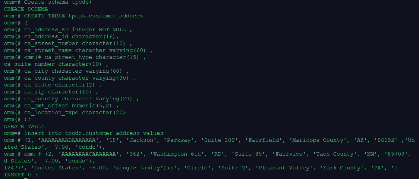 Create schema tpcds; CREATE TABLE tpcds.customer_address ( ca_address_sk integer NOT NULL , ca_address_id character(16), ca_street_number character(10) , ca_street_name character varying(60) , ca_street_type character(15) , ca_suite_number character(10) , ca_city character varying(60) , ca_county character varying(30) , ca_state character(2) , ca_zip character(10) , ca_country character varying(20) , ca_gmt_offset numeric(5,2) , ca_location_type character(20) ); insert into tpcds.customer_address values (1, 'AAAAAAAABAAAAAAA', '18', 'Jackson', 'Parkway', 'Suite 280', 'Fairfield', 'Maricopa County', 'AZ', '86192' ,'United States', -7.00, 'condo'), (2, 'AAAAAAAACAAAAAAA', '362', 'Washington 6th', 'RD', 'Suite 80', 'Fairview', 'Taos County', 'NM', '85709', 'United States', -7.00, 'condo'), (3, 'AAAAAAAADAAAAAAA', '585', 'Dogwood Washington', 'Circle', 'Suite Q', 'Pleasant Valley', 'York County', 'PA', '12477', 'United States', -5.00, 'single family');