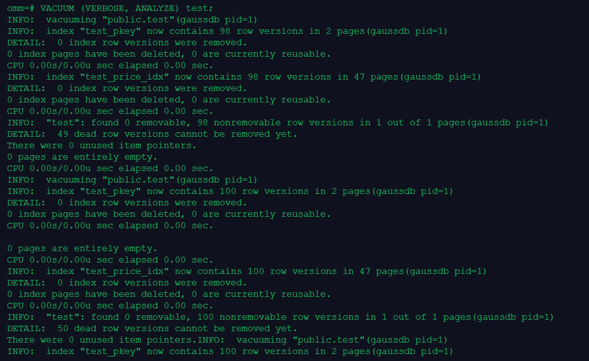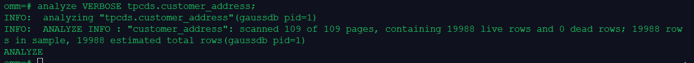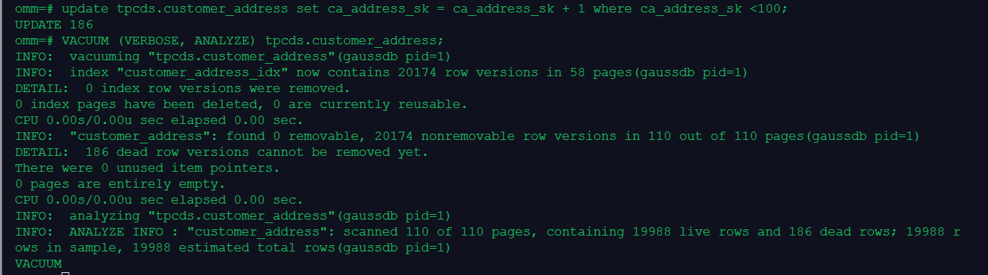 update tpcds.customer_address set ca_address_sk = ca_address_sk + 1 where ca_address_sk <100; VACUUM (VERBOSE, ANALYZE) tpcds.customer_address;