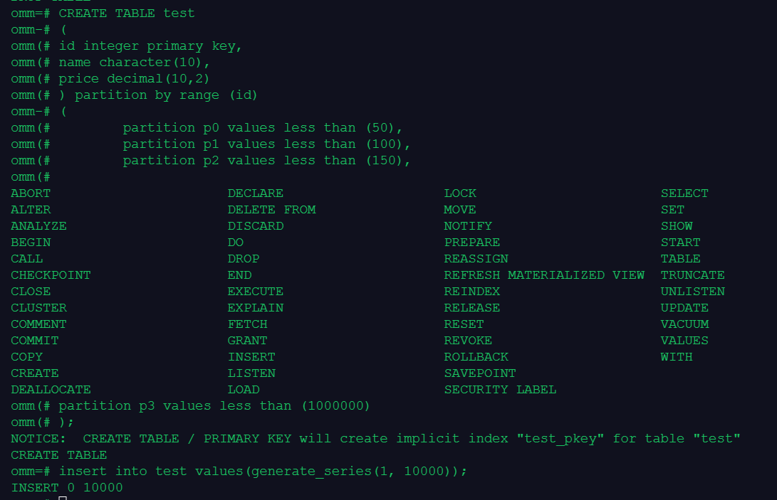 1.创建分区表,并用generate_series(1,N)函数对表插入数据