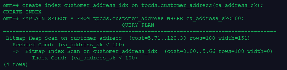 create index customer_address_idx on tpcds.customer_address(ca_address_sk); EXPLAIN SELECT * FROM tpcds.customer_address WHERE ca_address_sk<100;