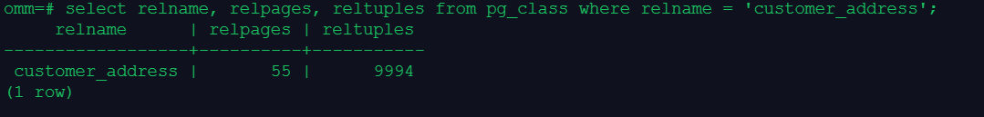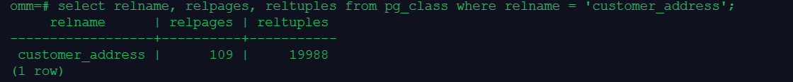 select relname, relpages, reltuples from pg_class where relname = 'customer_address';