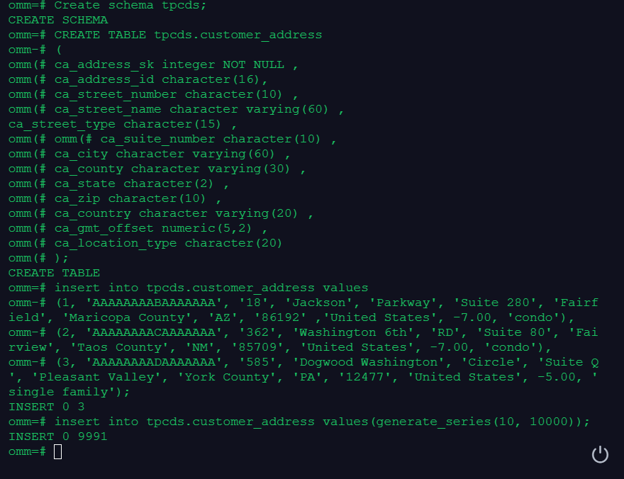 (3, 'AAAAAAAADAAAAAAA', '585', 'Dogwood Washington', 'Circle', 'Suite Q', 'Pleasant Valley', 'York County', 'PA', '12477', 'United States', -5.00, 'single family');insert into tpcds.customer_address values(generate_series(10, 10000));