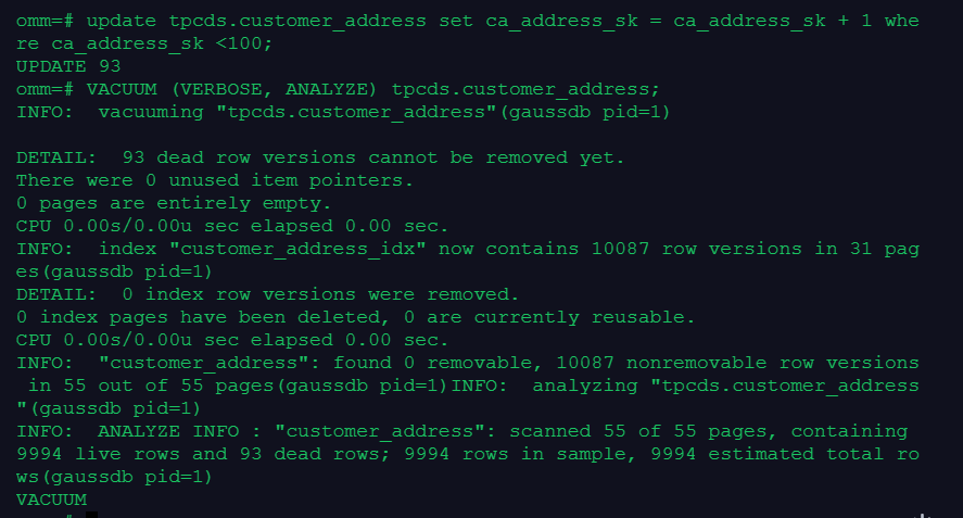 VACUUM (VERBOSE, ANALYZE) tpcds.customer_address;