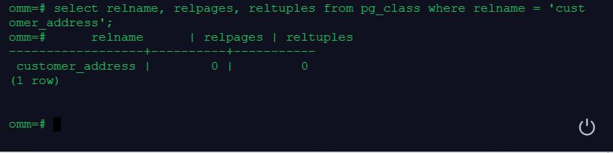 select relname, relpages, reltuples from pg_class where relname = 'customer_address';