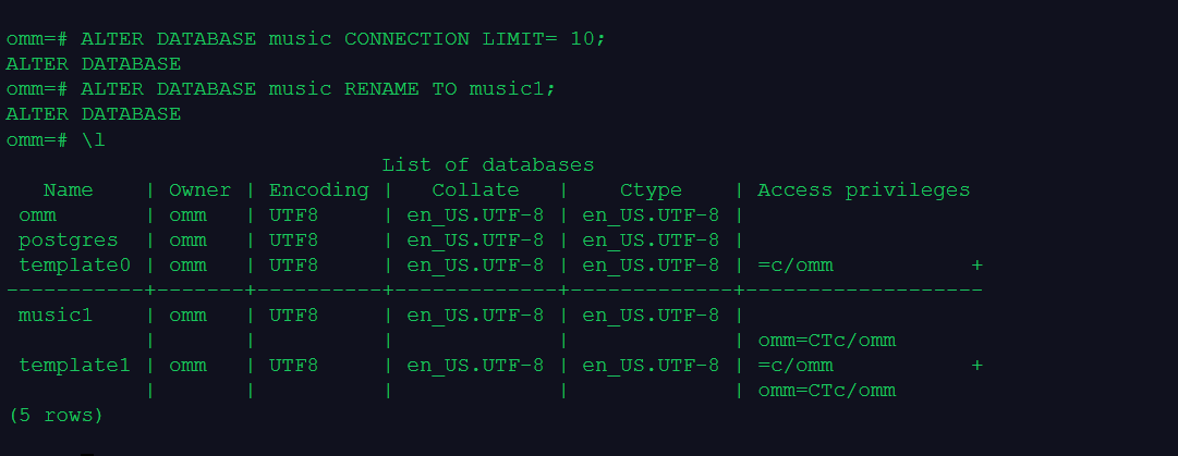 ALTER DATABASE music CONNECTION LIMIT= 10;