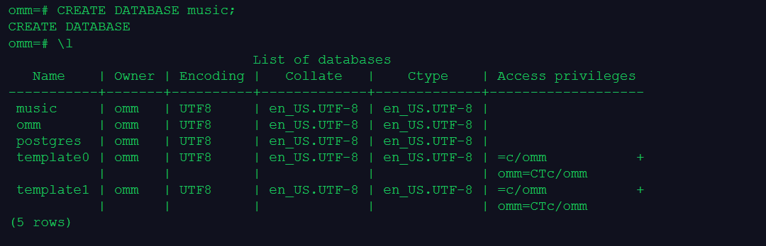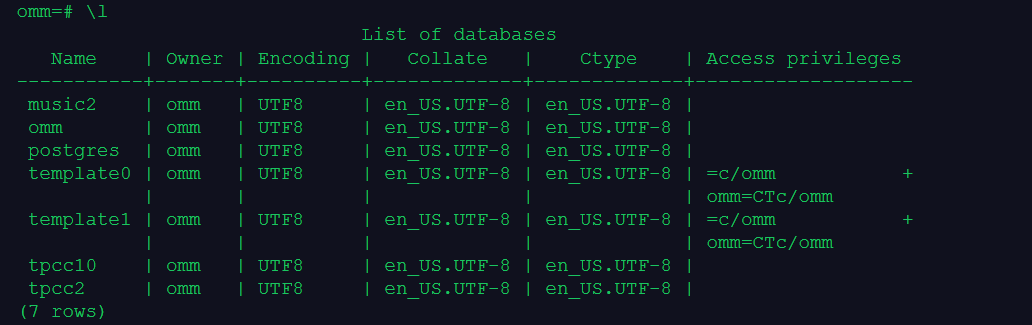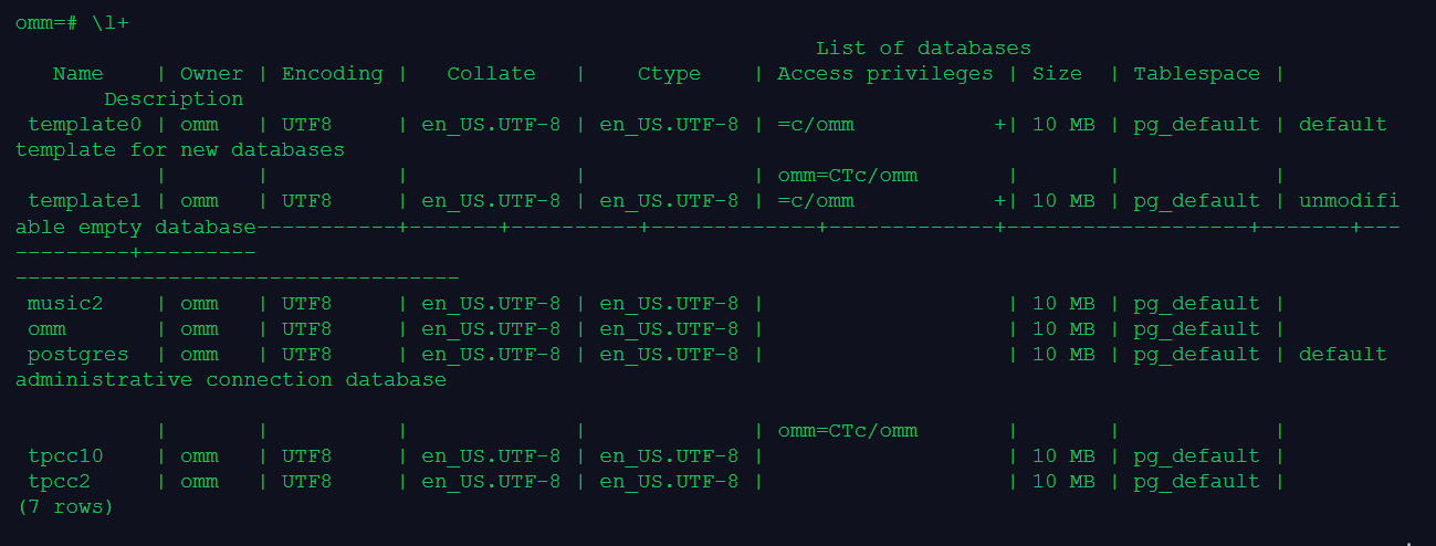 3.分别使用\l和\l+两个元命令查看数据库信息