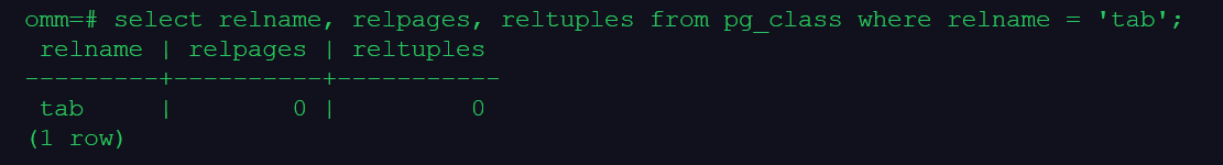 select relname, relpages, reltuples from pg_class where relname = 'tab';