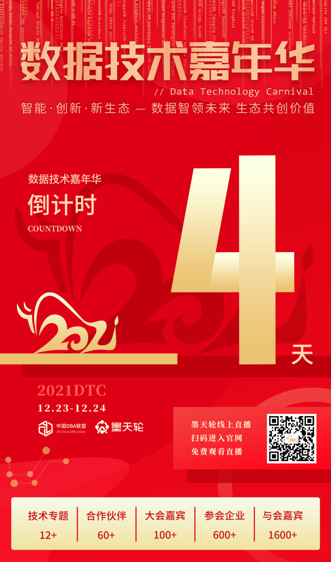 12月23-24日,2021数据技术嘉年华(DTC)将通过墨天轮社区线上举办。围绕“智能·创新·新生态——数据智领未来 生态共创价值”这一主题,来自数据领域的领军人物、学术精英、技术专家、行业实践者、生态布道者将带来超过60场主题演讲。想不想提前了解他们如何看待行业发展现状?最想跟大家探讨哪些新技术?对未来技术发展趋势有什么看法?针对大家感兴趣的问题,组委会将带来大会演讲嘉宾系列采访。还在等什么?精彩提前看起来!