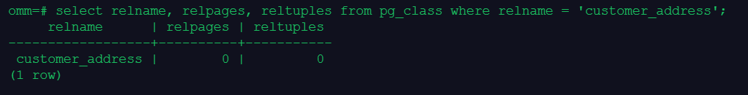 select relname, relpages, reltuples from pg_class where relname = 'store';